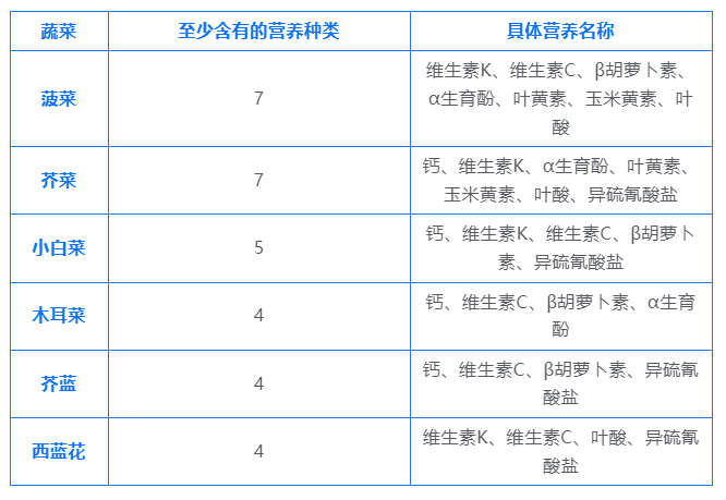 注册养分师谷传玲2024年在个东谈主微信公号刊文先容,从常见的20多种深绿色蔬菜中,筛选出了最值得吃的6种深绿色蔬菜,它们富含的养分素种类更多(括号里的数字是富含的养分素的种类),含量也不低,辞别是:菠菜、芥菜、小白菜、木耳菜、芥蓝、西蓝花,提议每天至少吃2拳头(200克)。